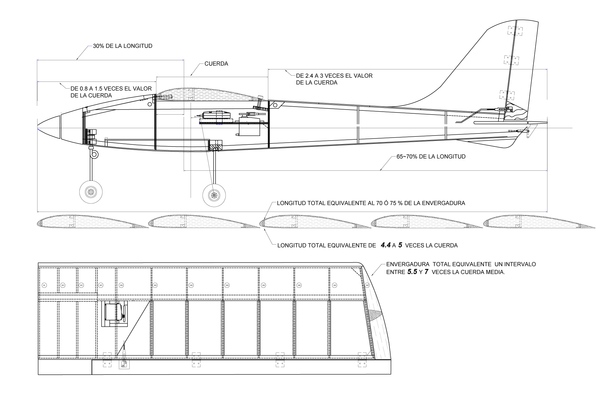 En cambio si partimos de la cuerda media del ala, la envergadura será entre 6 o  7 veces la medida de esta y la longitud del fuselaje alrededor de 4.6 veces la cuerda.