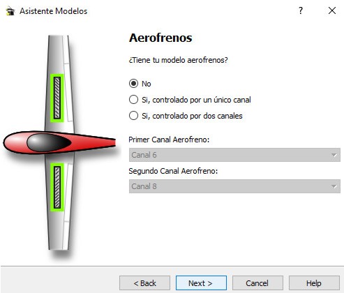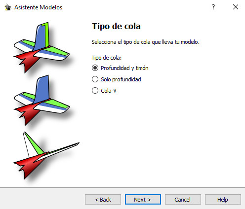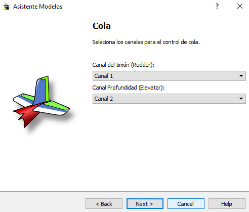 Para nuestro primer modelo dispondrémos la cola en T, clásica, con dirección y profundidad, asignándoles los canales 1 y 2 respectivamente. Avanzamos pinchando en siguiente.