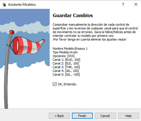 El modelo tal y como sale del asistente no es volable todavía. Es necesario completarlo con importantes detalles como los exponenciales, dual rates, comprobar el sentido y recorrido de los servos, etc.