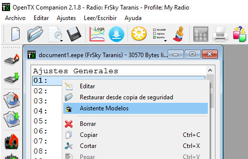 OpenTx Companion nos ofrecerá  un interfaz muy intuitivo para la programación, un simulador para visualizar lo que estamos creando y el preciado WIZAR, un script que creará un modelo tipo en pocos minutos según le vayamos indicando la características básicas del modelo: Ala fija, motor, tipo de cola, número de servos en los alerones, etc.