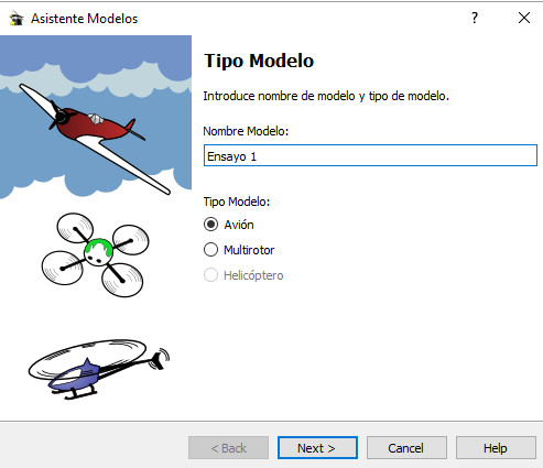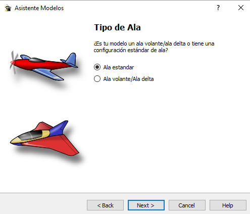 El objetivo de este primer proyecto es crear un avión sencillo con alerones controlados por servos independientes. Así que seguimos con el asistente que acabamos de llamar.