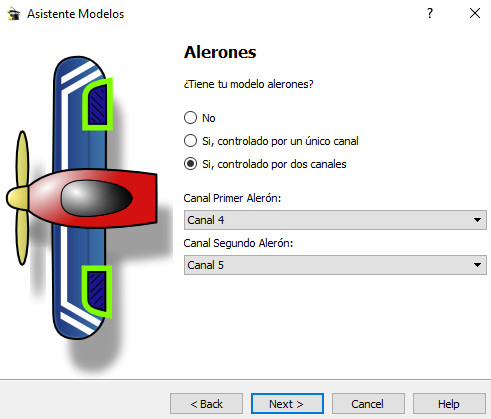 Debemos definir tipo de alerones. Seleccionaremos un servo en cada ala asignándoles los canales 4 y 5 respectivamente. Como siempre pulsamos siguiente para continuar.
