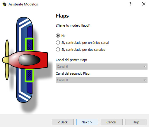 ¿Flaps? En este primer modelo vamos a decir que no tiene. Y siguiente para avanzar.