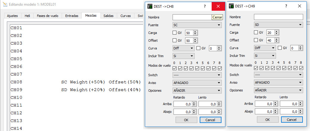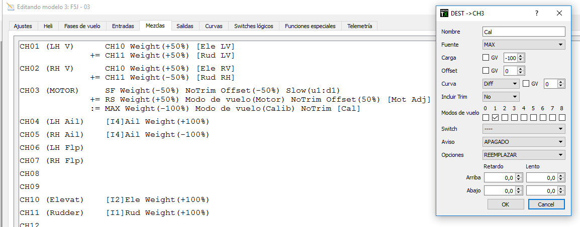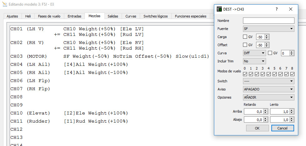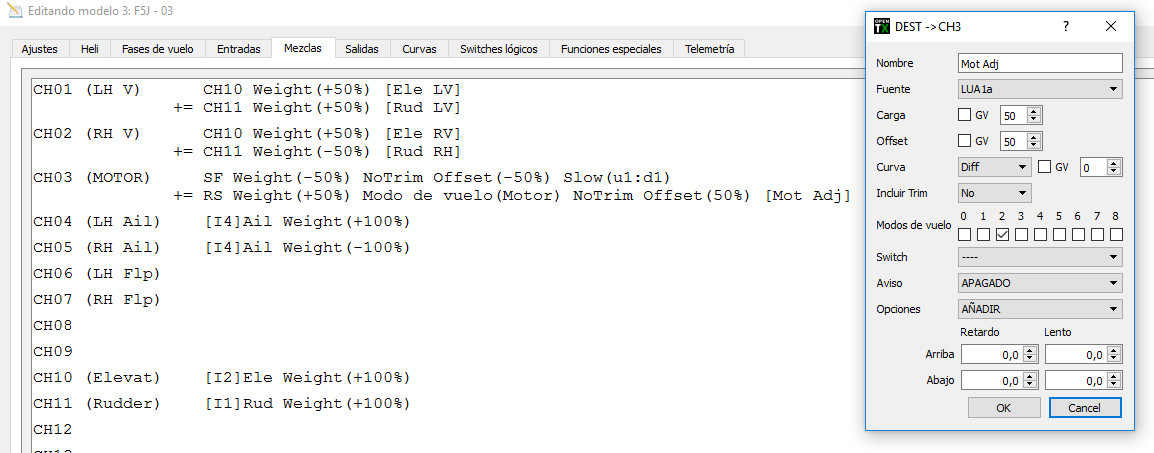 Los valores que toma CH3 van de -100 (motor parado) a 100 (motor a tope), es decir, que si hemos asignado un peso de 5 a la mezcla, esta tomará valores entre -5 y 5. Para evitar cualquier compensación con el motor parado, desplazamos toda la mezcla un 5%, Offset 5, de forma que esta tome valores de 0 (motor parado) a 10 (motor a tope).
