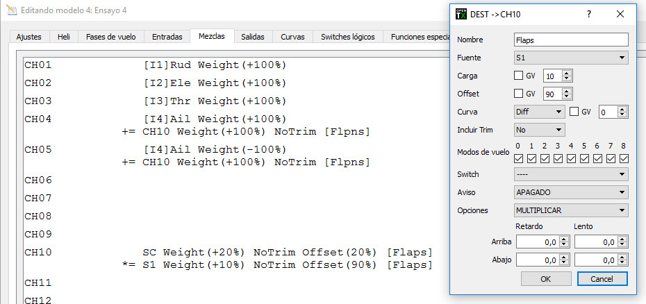 Ahora lo asignamos a S1 y lo mezclamos con los flaps. En la Página de mezclas añadimos una nueva línea al canal de Flaps CH10: