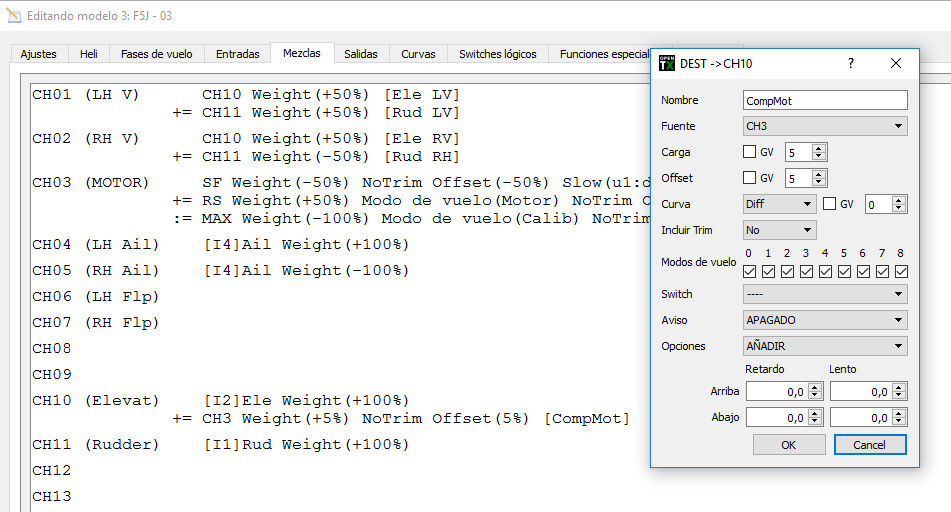 Implantaremos esta mezcla en el canal de nuestra profundidad virtual, CH 10, y la nombraremos CompMot (Compensador por Motor). La fuente será el canal del motor, canal CH3. El peso que debamos dar dependerá del modelo en concreto, pero generalmente estará en torno a 5, valor que deberemos comprobar y ajustar en vuelo.