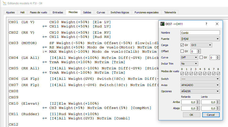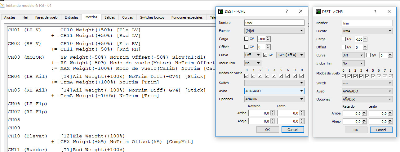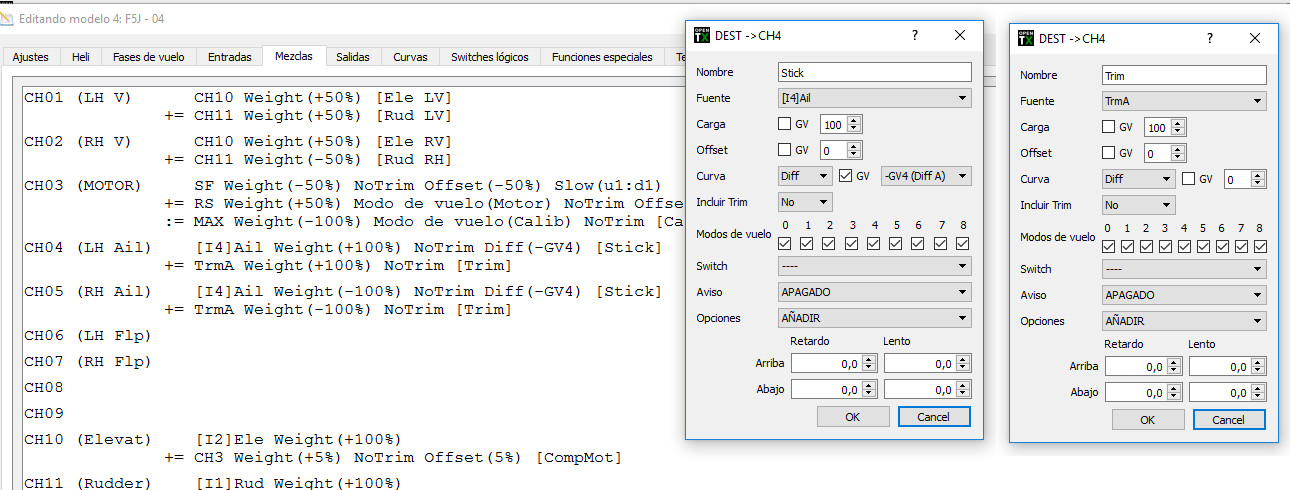 En la imagen vemos los diálogos abiertos para introducir primero la mezcla del stick de alabeo y luego la línea de trim del alerón izquierdo, canal 4.