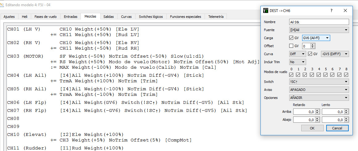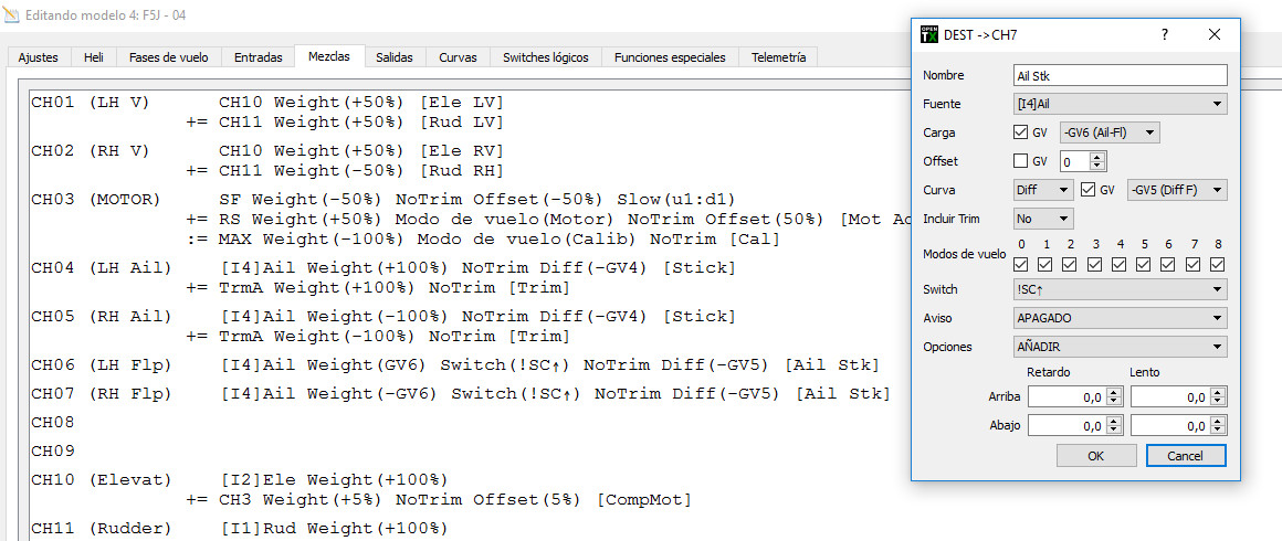 Si os fijáis, no introducimos el trim de alabeo en la mezcla de los Flaps, canales 6 y 7.