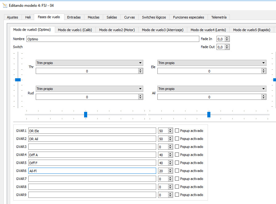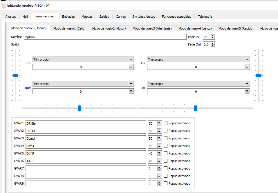 A continuación deberemos dar contenido a cada una de estas variables globales. En la página de Fases de Vuelo, iremos seleccionando las lengüetas de los diferentes modos de vuelo para ir introduciendo progresivamente las cifras correspondientes.