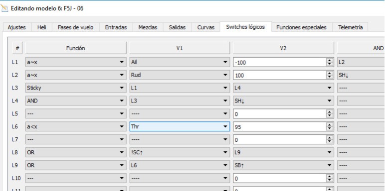 Iremos a la página de Interruptores Lógicos para crear L9 y modificar L8, interruptor que sigue siendo el encargado de activar las mezclas de Flaps en los alerones.