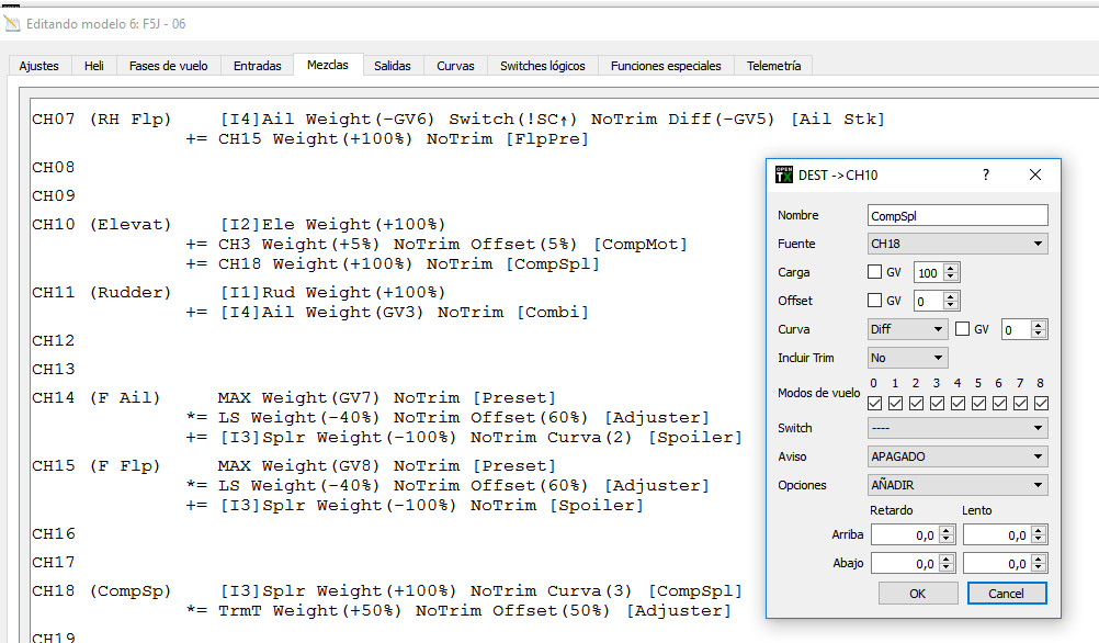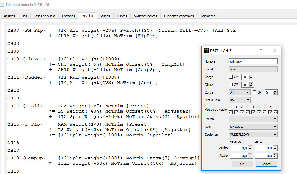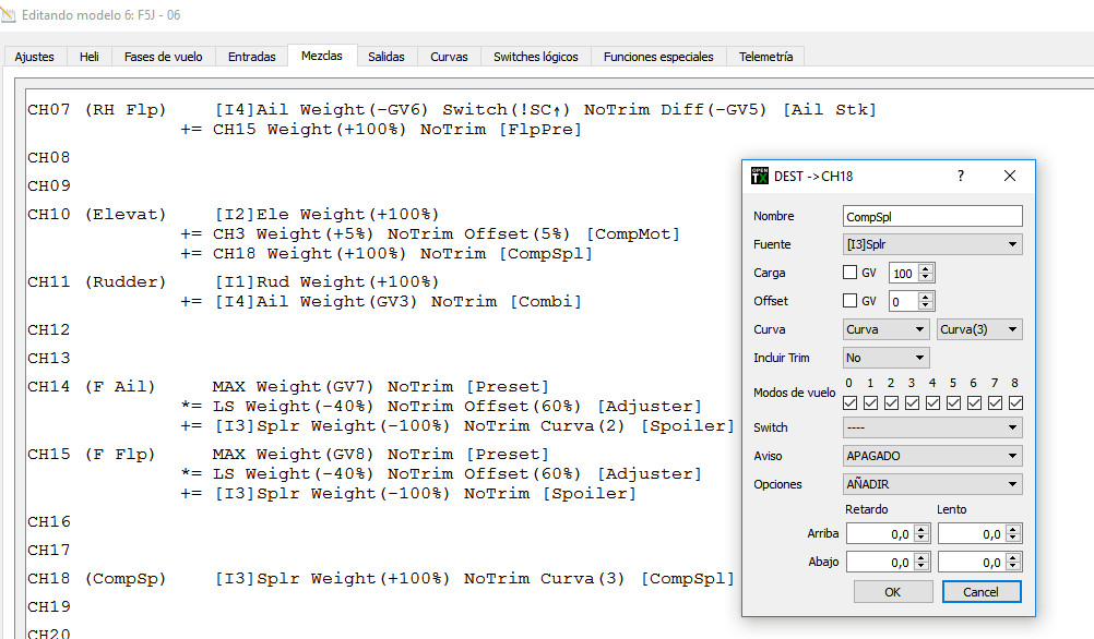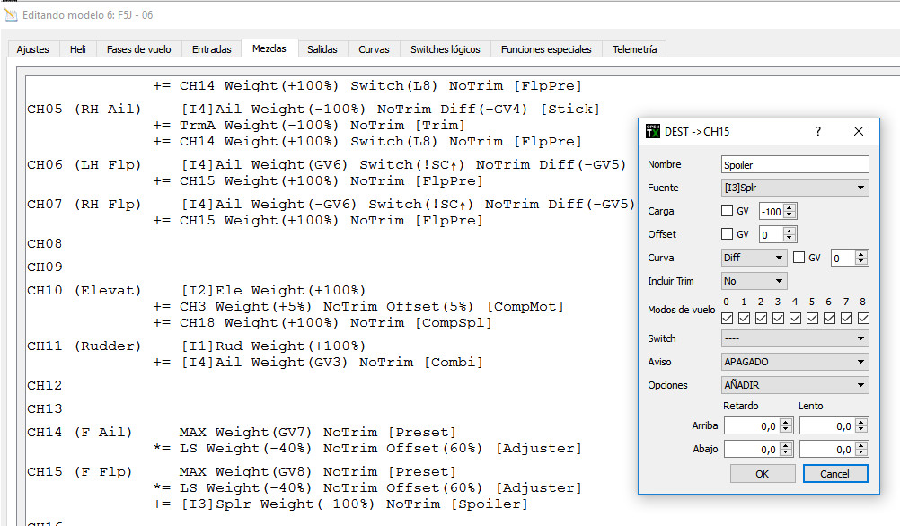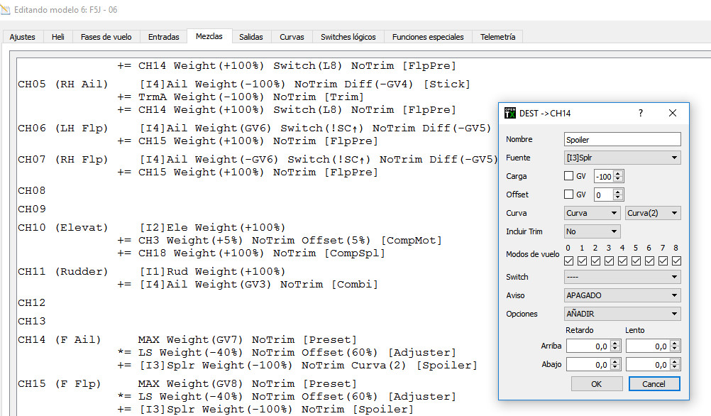 Hecho esto, podemos incluir la línea de mezcla que levante los alerones cuando despleguemos el Spoiler. Para ello basta añadir una nueva línea en nuestro canal de Flaps Virtuales para los alerones CH14.