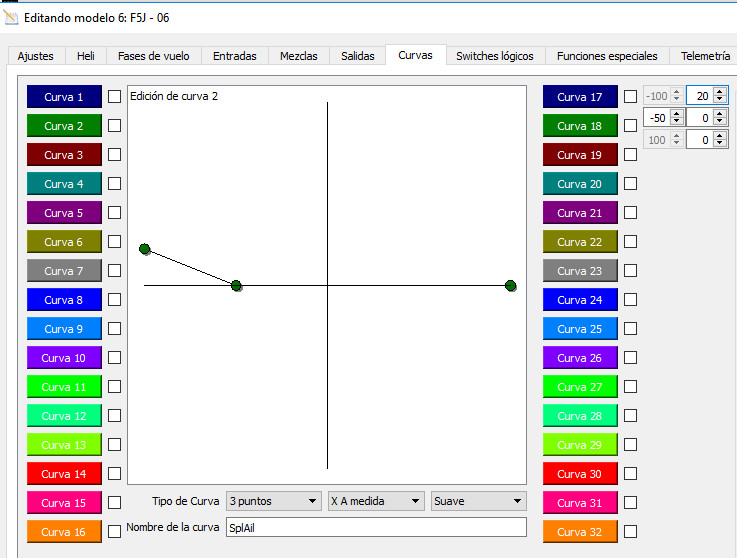 - El valor máximo que da el stick de motor, [I3] Splr, es 80 con el stick arriba del todo, porque así lo hemos diseñado. Por tanto, para valores superiores de 80 la compensación debe ser nula. Haremos nula la curva entre los valores 100 y 80, y creciente entre 80 (stick arriba del todo) y -100 (stick abajo del todo).