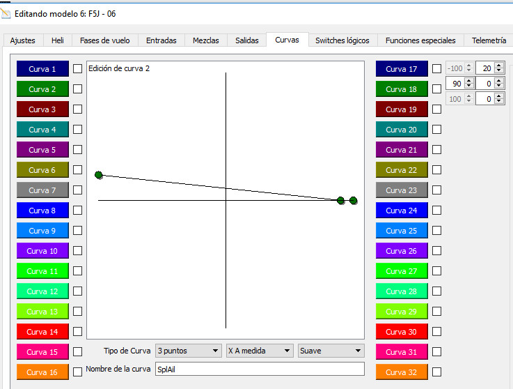 En la página de curvas, seleccionamos la curva 2, para nombrarla SplAil. Para construirla será suficiente una curva de 3 puntos. Deberemos seleccionar ‘X a medida‘ y la opción suave. En el cuadro de coordenadas introducimos los valores de nuestros 3 puntos: