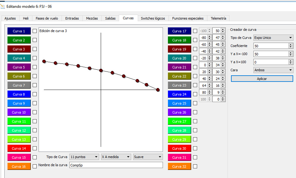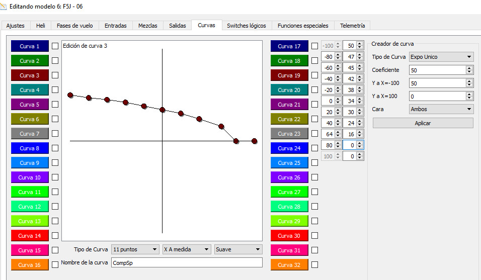 Así que vamos a construir tal curva. Para ello, en la página de curvas seleccionamos la curva 3, nombrándola CompSp. Seleccionamos curva de 11 puntos, con X a medida y suave.