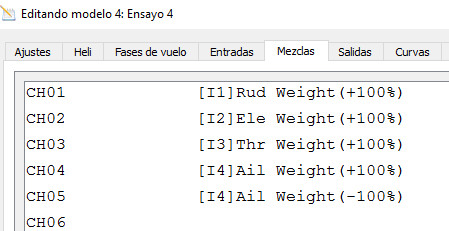 Como vemos es un modelo muy sencillo, en el que cada canal corresponde a un servo. No existe todavía ninguna mezcla y cada servo responde directamente a los movimientos de los sticks. En el caso del alerón derecho (canal 5), el peso tiene signo negativo para darle sentido opuesto al del alerón izquierdo (canal 4), de forma que cuando suba uno el otro baje y viceversa.