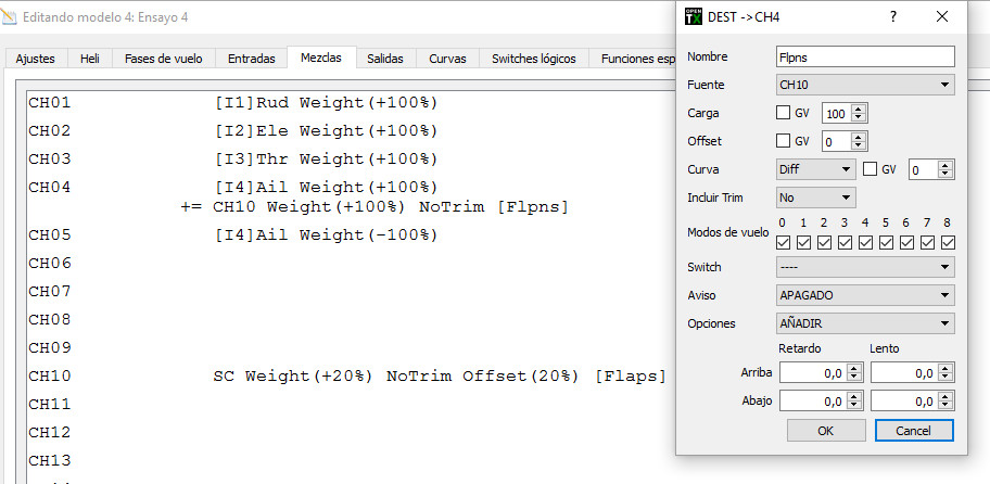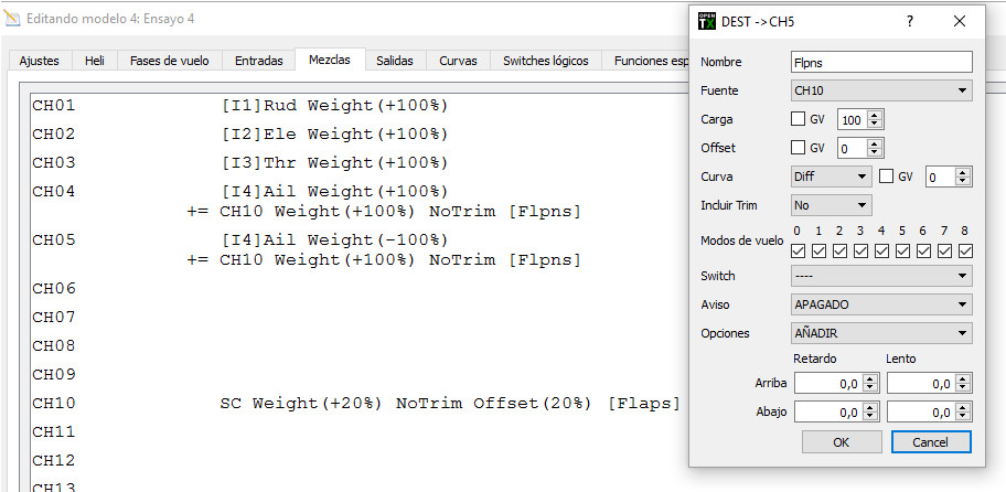 Hemos de repetir la operación con el alerón derecho. Click con el botón derecho en la sexta línea, CH5 de la página de Mezclas. En el desplegable seleccionamos Añadir, de forma que se nos abre el cuadro de diálogo de la línea que añadamos. La nombramos como Flpns, en el campo Fuente seleccionamos CH10 (que es nuestro flap) y NO en el campo Incluir Trim. OK para guardar los cambios.