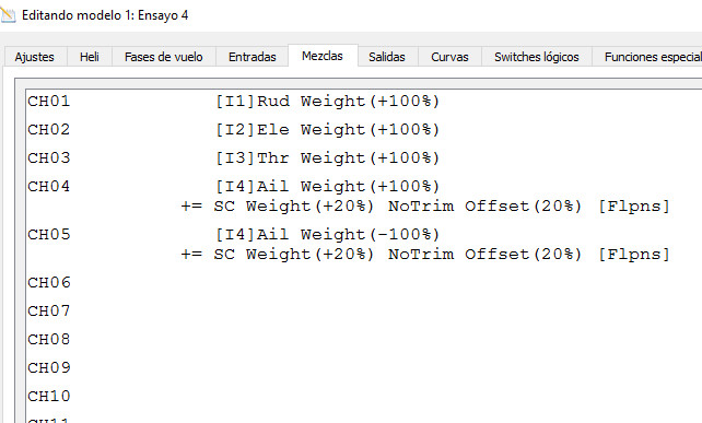 - Cualquier cambio del comportamiento de los flaps que nos interese realizar será siempre sobre las líneas del canal 10 (Flaps). No hará falta, buscar y modificar los alerones ni el resto del modelo. Todo dentro del canal 10.