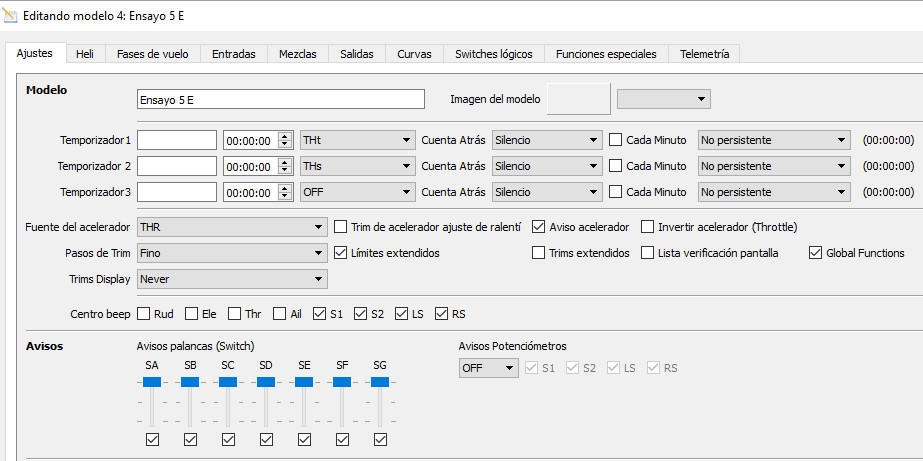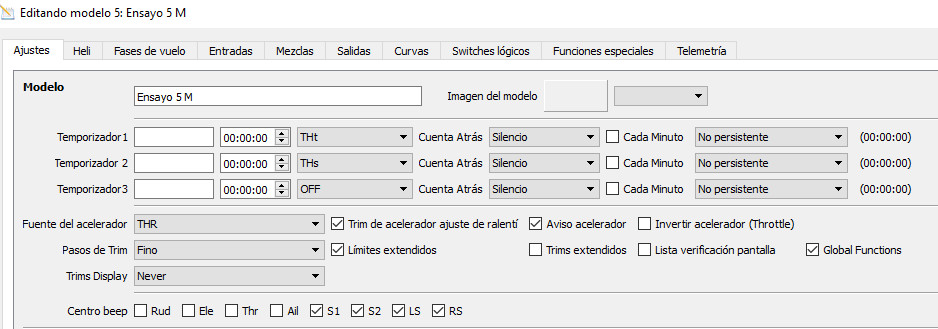 Abrimos en OpenTx Companion nuestro modelo. En la página de ajustes nos aseguramos que la Fuente del acelerador (bonita traducción) es THR y debemos dejar sin selecionar la casilla de Trim de acelerador ajuste de ralentí.