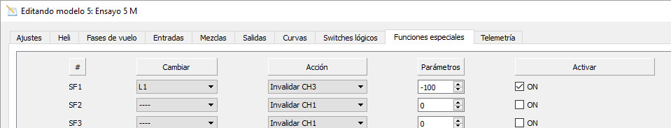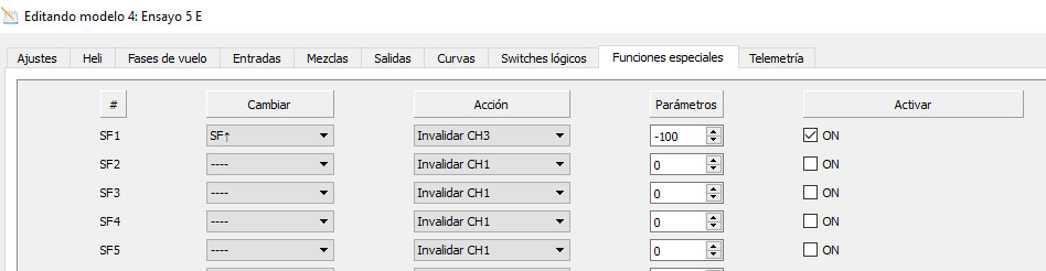 Click con el botón izquierdo en la pestaña de Funciones especiales. Vamos a la primera línea, SF1 y en el campo Cambiar seleccionamos el interruptor SF?, que será el que nos haga la condición cierta para que actúe la función. En el campo Acción debemos seleccionar Invalidar CH3 (el canal de nuestro motor), en el campo Parámetros ponemos -100 (motor parado) y finalmente activamos la función seleccionando ON en el campo Activar.