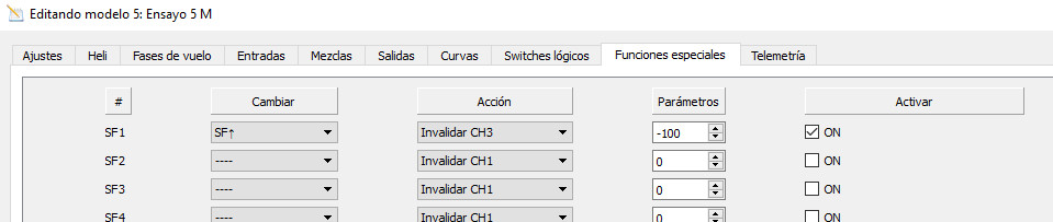 Click con el botón izquierdo en la pestaña de Funciones especiales. En el campo Cambiar seleccionamos el interruptor SF?, que será el que nos haga la condición cierta para que actúe la función. En el campo Acción debemos seleccionar Invalidar CH3 (el canal de nuestro motor), en el campo Parámetros ponemos -100 (motor apagado) y finalmente activamos la función seleccionando ON en el campo Activar.