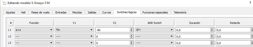 Click con el botón izquierdo en la pestaña de Switches lógicos. En el campo Función de la primera línea, correspondiente al interruptor L1, seleccionamos a<x (función ‘menor que’). La primera variable , V1, es la posición del stick de motor, Thr. La segunda variable, V2, es el valor de referencia en el que consideramos el motor al ralentí y a partir del cual podemos cortar -90.