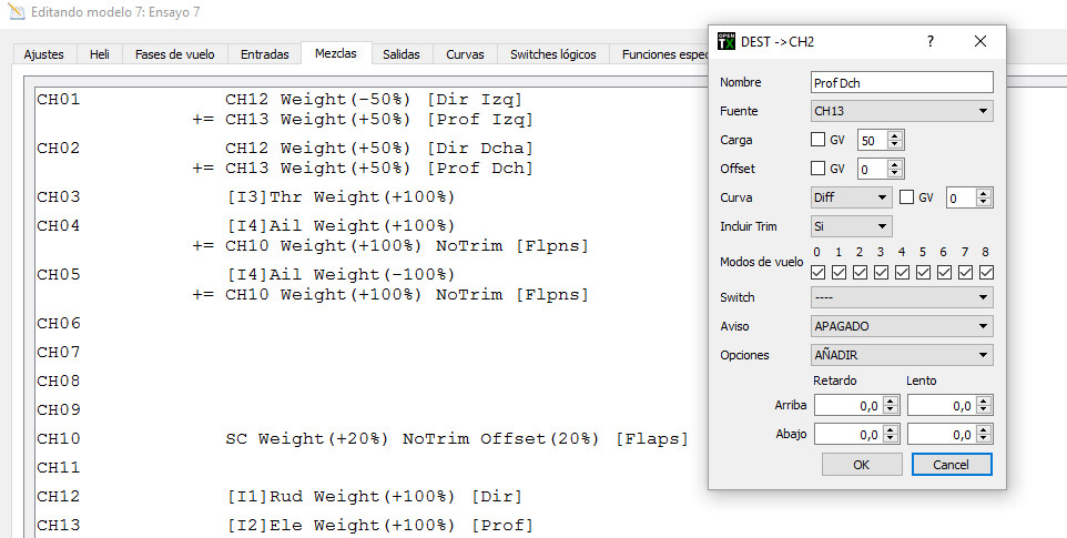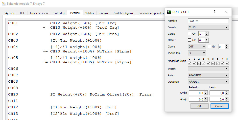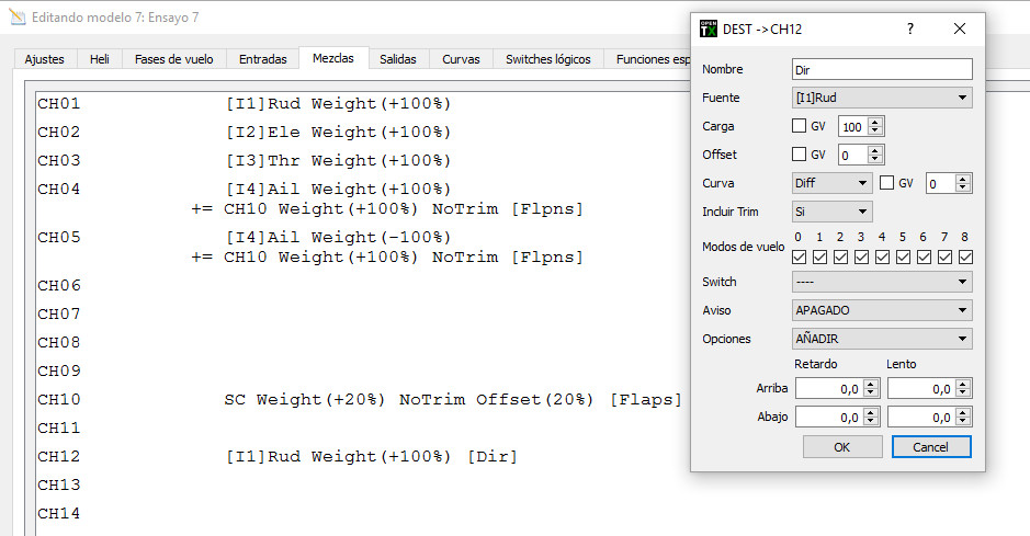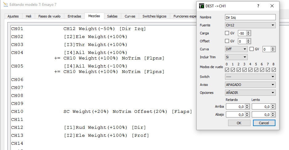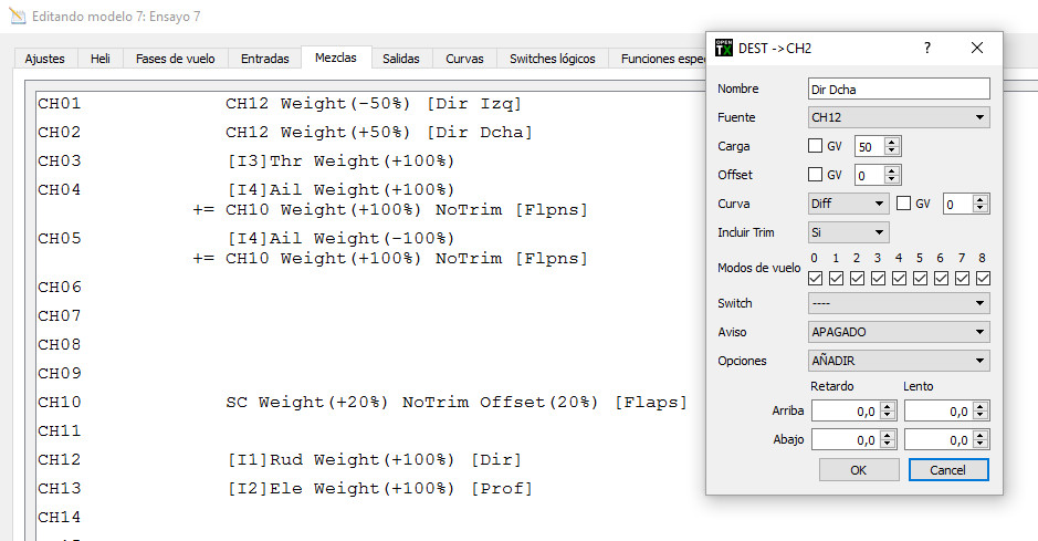 Para llevar la dirección a la aleta derecha, editamos el canal CH2 y escribimos como Nombre Dir Dcha, Entrada CH12, Carga 50 y OK para aplicar los cambios.