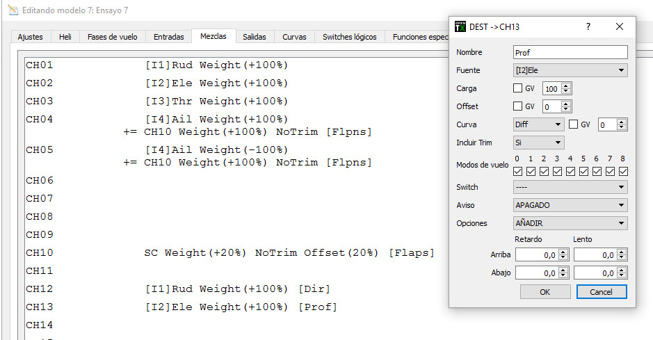 Por ejemplo, hay aviones que al dar gas, tienden a levantar el morro y necesitan compensar con algo de profundidad a picar. Si este fuera el caso de nuestro modelo podríamos hacer una mezcla que según acelere el motor baje ligeramente la profundidad. Para ello bastaría añadir la siguiente línea: