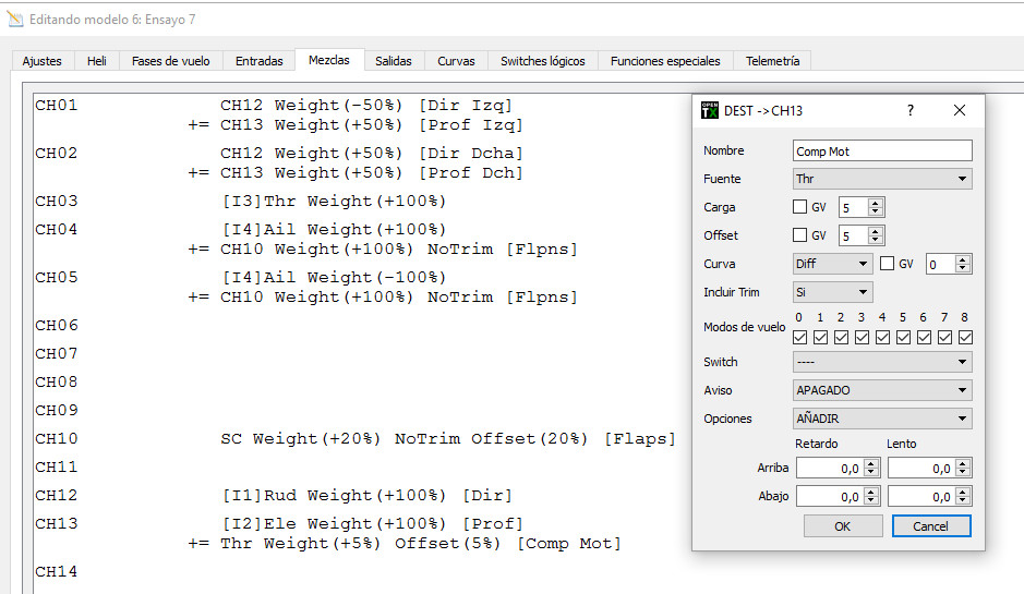 Botón derecho en nuestra profundidad convencional (CH13), seleccionamos Añadir y ponemos en el campo Nombre Comp Mot, como Fuente el stick de motor Thr, de Carga 5 (es la cantidad de compensación que aplicaremos, un valor arbitrario que dependerá del comportamiento en vuelo del modelo) y finalmente desplazamos la mezcla a valores positivos para que cuando el stick de motor esté abajo del todo, la compensación sea nula Offset 5.