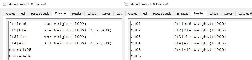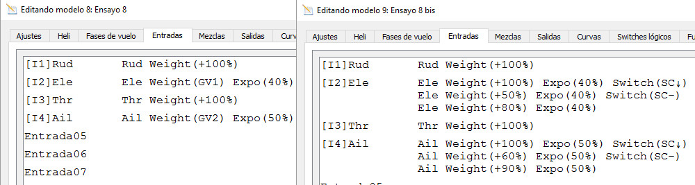 Otro inciso antes de seguir con nuestro objetivo. Si nos fijamos, estas programaciones son equivalentes. La primera con fases de vuelo y variables globales; la segunda con la técnica explicada en el tutorial dedicado a Dual Rates.