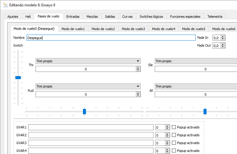 Sin ir muy lejos, y a modo de ejemplo; el despegue, crucero y aterrizaje ya requieren ajustes diferentes. Podríamos estar trimando el modelo constantemente para pasar de uno a otro, pero OpenTx nos ofrece la opción de definir diferentes Fases de Vuelo a través de una programación realmente sencilla y flexible que nos facilitará mucho el trabajo.