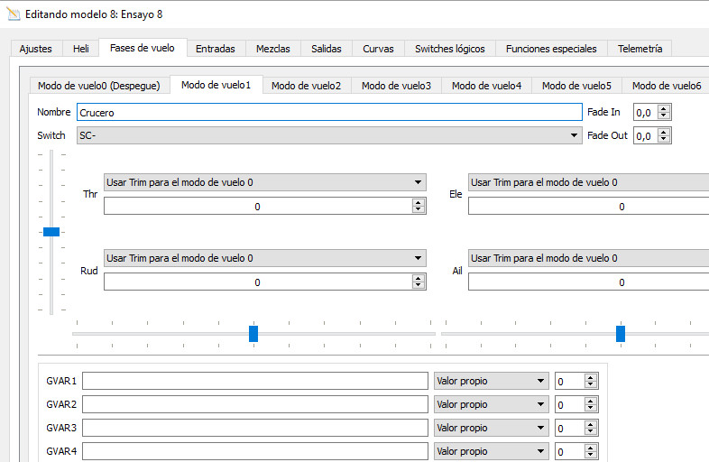 OpenTx nos ofrece hasta 9 Variables Globales. En cada una de ellas podemos almacenar un valor distinto para cada una de las fases de vuelo que definamos. Es decir, que podemos almacenar la sensibilidad que deseemos en cada Fase de Vuelo.