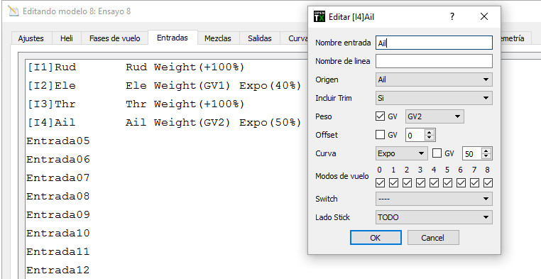 Ya funciona todo…..Pero, falta por explicar una de las herramientas más potentes que nos ofrece la programación con las Fases de Vuelo. OpenTx puede discriminar a qué Fases de Vuelo se aplica cada una de las líneas de mezclas.