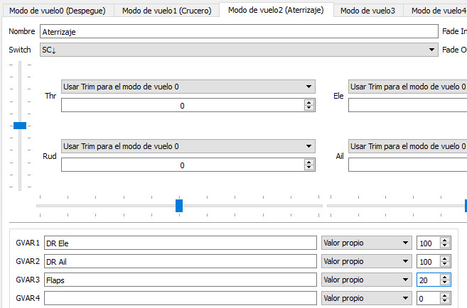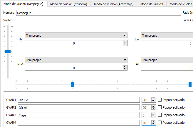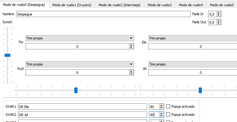 Vamos a la página de Fases de Vuelo y nombramos DR Ele a la variable GVAR 1, y una línea más abajo nombramos DR Ail a la variable global GVAR 2. Como estamos en el modo de Despegue, les damos el valor 80 y 90 respectivamente. A estas alturas seguro que has adivinado que DR viene de Dual Rate….