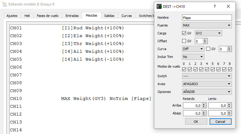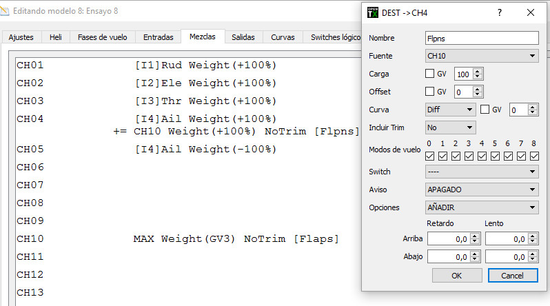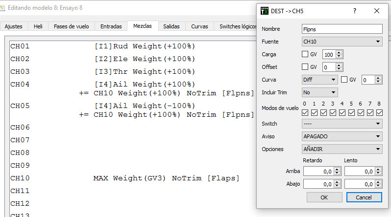 Hemos de repetir la operación con el alerón derecho. Click con el botón derecho en la sexta línea , CH5 de la página de Mezclas. En el desplegable seleccionamos Añadir, de forma que se nos abre el cuadro de diálogo de la línea que añadamos. La nombramos como Flpns, en el campo Fuente seleccionamos CH10 (que es nuestro flap) y NO en el campo Incluir Trim. OK para guardar los cambios.