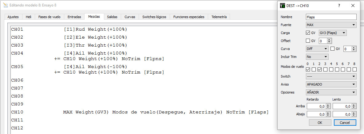 Vamos a la página de Mezclas y editamos el CH10 con doble click de botón izquierdo. En Modos de Vuelo dejamos seleccionados solamente el 0 (Despegue) y el 2 (Aterrizaje). OK para guardar los cambios.