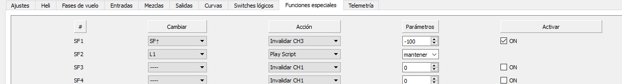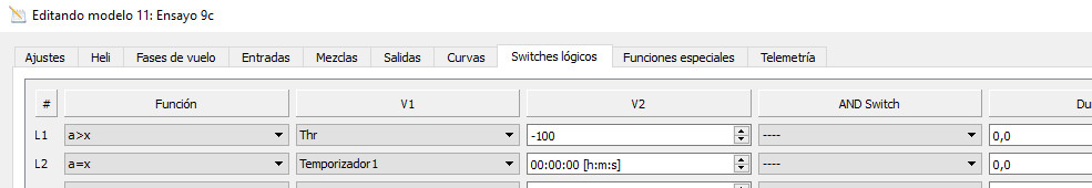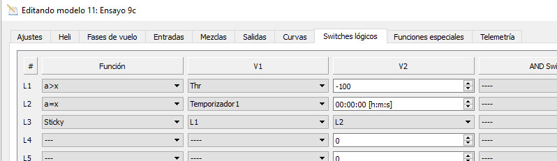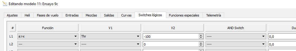Vamos a la página de Switches Lógicos. En la primera fila ponemos Función a>x, en V1 seleccionamos el stick de motor Thr y en V2 nuestro valor umbral -100.