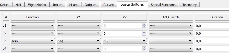 En OpenTx Companion, entramos en la página de interruptores Lógicos y en la tercera línea (interruptor lógico L3) seleccionamos función AND y entradas V1 SA? y V2 SC?.