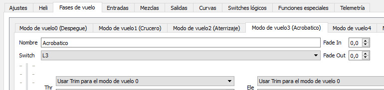Ahora ya solo queda asignar L3 como interruptor de activación del modo de Vuelo Acrobático. Para ello, vamos a la página de Fases de Vuelo, nombramos nuestro nuevo modo de vuelo como Acrobatico y seleccionamos L3 en el campo Switch.