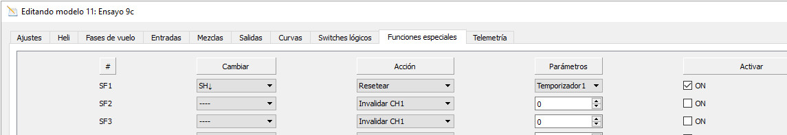 En la página de Funciones especiales definimos SF1 con SH? en el campo cambiar, acción Resetear, parámetro Temporizador 1 y finalmente Activar ON.