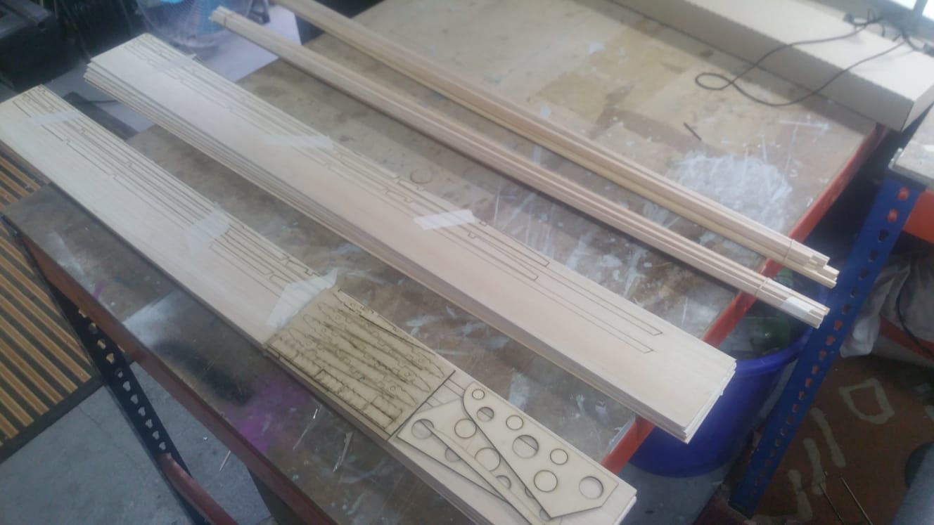Alas en foam de poliestireno expandido de una envergadura de 1800 mm, con tres acabados distintos, lluis las forradas con cinta de embalar, fendrich con papel karft y cola blanca y Luar las hará en fibra de vidrio.
