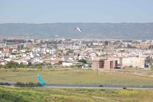 Recojo bartulos y tomo el camino de vuelta, pero como a 200 metros veo una laderita de campiña con un miserable talud en medio y bien orientada al viento que ahora es suave (está atardeciendo). Esto no va a quedar así, decido probar a volarlo sin motor. Sorpresa... ¡Alucinante! va como la seda y engancho en la ladera muy justito, pero es que eso no es una ladera y solo hay una brisa ya. Doy varias pasadas con sus giros de 180, va muy bien, lo meto para atrás y aterrizo bien. No me lo puedo creer. Así he seguido con varios lanzamientos y vuelecitos tranquilos de ladera disfrutando a tope hasta que el viento ya no daba para mas. De vuelta a casa muy contento he reemplazado la pala con una del juego que trae de repuesto y he colocado bien el agarre, el motor va bien. Fenomenal.