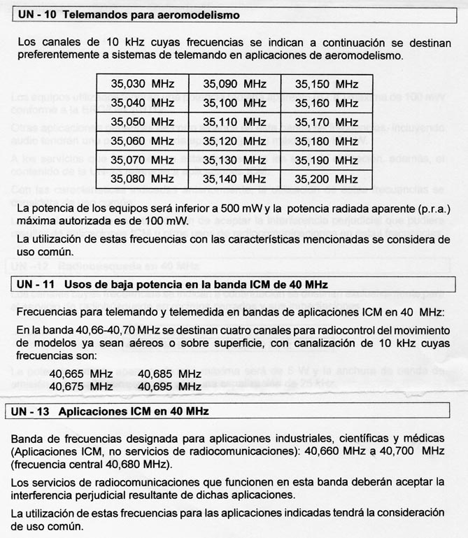 Para usarlas en aeromodelismo deportivo (el nuestro) no estan autorizadas, posiblemente puedan usarse legalmente en los aeromodelos que usa el ejercito como blanco, pero para los nuestros solo nos permiten las 18 frecuencias de 35mhz, no todos los aeromodelos se usan para practicar el aeromodelismo.Jesús Angel Serrano escribió: P/D Antonio Oviedo, hay 4 frecuencais en la gama de 40 que tambien estan autorizadas.