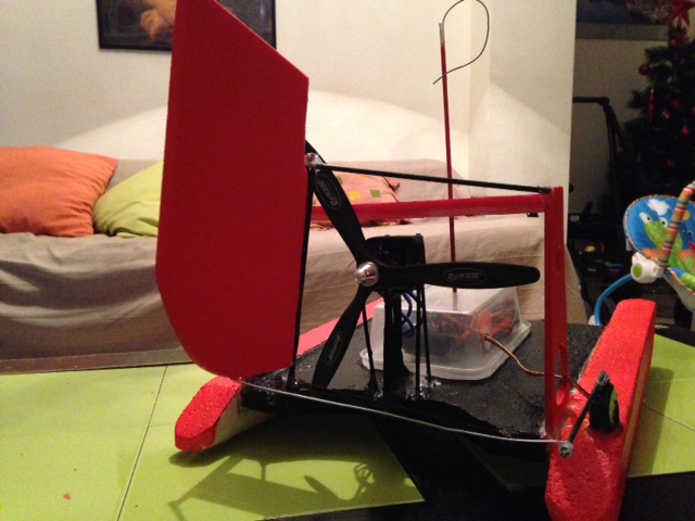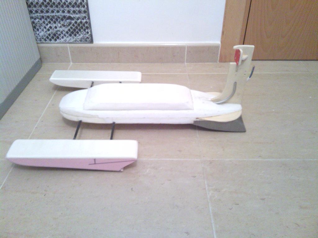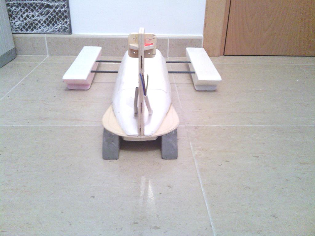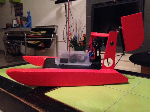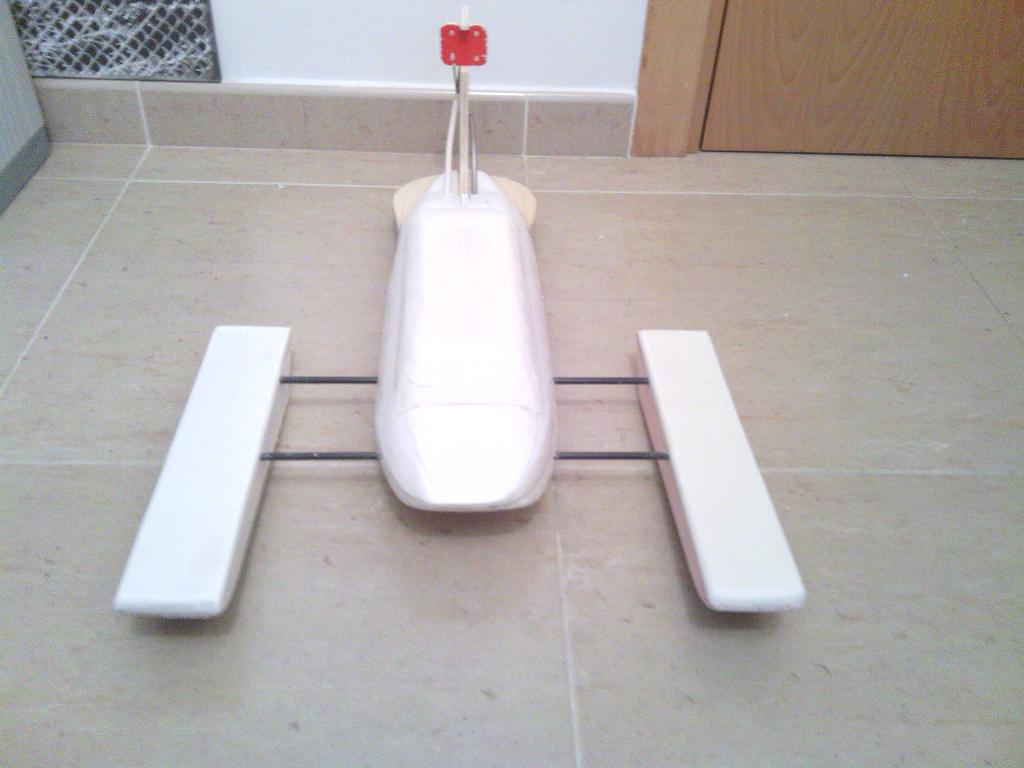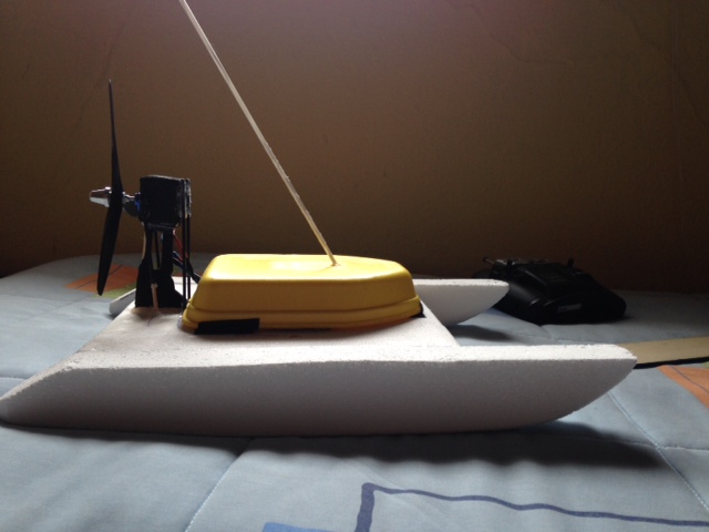 bueno tras el fiasco de la primera versión del hidro os presento la versión del mismo 2.0 jaja es mas ancho mas bajo y con el motor en la parte posterior, hoy he realizado una prueba en la bañera y parace mucho mas estable y rápido que el anterior no l ehe querido colocar timón ni pintarlo hasta no estar seguro de como iba lo pintare igual que la versión anterior que me gustaba la idea creo que en un par de días estará listo aquí van las fotos aun sin terminar.