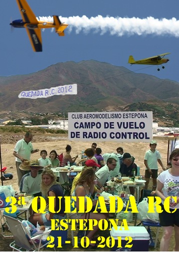Afilar vuestras hélices. El próximo 21 de Octubre 2012 celebraremos en la pista de Aeromodelismo de LAS MESAS, Estepona, la 3ª QUEDADA RC. La edición anterior fue un autentico éxito superando la participación de la anteriro. Por ello suponemos que en esta vendrán todavía más aeromodelistas. Pasaremos el día juntos haciendo volar nuestros aviones, helicópteros, autogiros y todo aquello que vuele. Por razones presupuestarias cada participante de la quedada deberá traer su comida. La bebida la pone el Club.