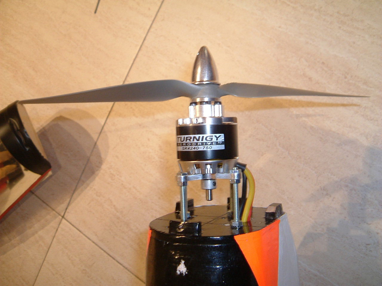 Manos a la obra, en las pruebas estáticas en casa con el motor que veis en la foto y 6 elementos A123 y una hélice 10*5 obtengo 450 watios, Centro de gravedad en su sitio teórico.