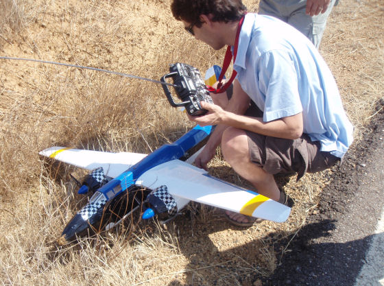 El aterrizaje fue bastante bien. Tras unas cuantas pasadas con flaps para probar velocidades, encaré la pista bien enfilado, aunque se levantó un poco de viento que dificultó la maniobra. A falta de un metro para posarse, perdió sustentación y alabeó (hay que entrar con algo más de gas). Se posó en la carretera pero con el alabeo del final no pude evitar que aparcara en la zanja. Sólo se ha roto la pieza que sujeta la rueda delantera, un arreglo que además me permite añadirle algo más de peso al morro.