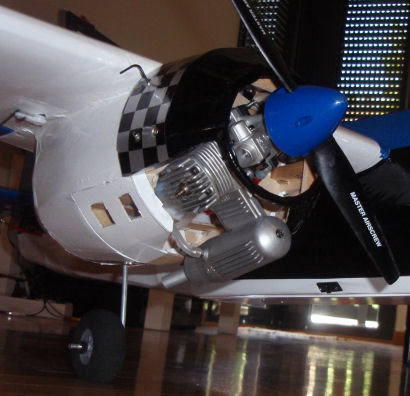 Los motores son simétricos. Para poder acceder al servo y al depósito puse dos compuertas, una junto al tren de aterrizaje para poder ver el servo del gas, y otra en la parte delantera por donde entra el depósito de gasolina.