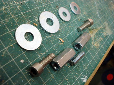 He utilizado casquillos roscados de 25mm de largo con forma hexagonal de los utilizados en ebanisteria para montaje, los he unido por pares empleando una varilla roscada de 6 mm, juntos me dan esos 50mm que necesitaba, luego con las arandelas de asentamiento de ala ancha, he conseguido llegar a los 52-54 mm que necesitaba para ajustar el cono a la carena. Finalmente he utilizado tornillo con cabeza Allen en los extremos para dejar bien apretado todo el conjunto. Naturalmente cada rosca lleva unas cuantas gotas de fijatornillos, lo cual una vez rodado el motor cerca de 100 minutos, ha resultado ser de lo más efectivo. Estoy contento una cosa grande.