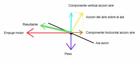 El motor crea una fuerza roja que hace que el avión avance. La velocidad del ala con respecto al aire genera en el ala un empuje (flecha amarilla) cuya magnitud dependerá de la velocidad relativa aire-ala y su dirección del ángulo de incidencia del ala. Esta fuerza se puede separar en sus componentes horizontal (flecha marrón) y vertical (flecha azul claro).