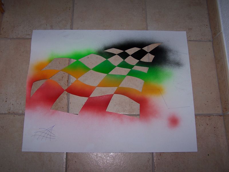 Sobre el tema pintura os pongo una foto de una de las plantillas. Es muy facil y tampoco tiene mucho trabajo. Yo las hago con cartulina, dibujo el perfil del ala y sobre este empiezo a dibujar a lapiz las lineas. Luego recorto un con un cuter y listo para darle espray.